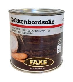 FAXE Køkkenbordsolie er specielt udviklet til nem grundbehandling, renovering og pleje af træoverflader, der skal være vandafvisende og slidstærke. Produktet er på basis af rene naturolier. Findes i fire forskellige farve varianter : Natur, Hvid, Sort, Drivtømmer Grå og Mahogni.