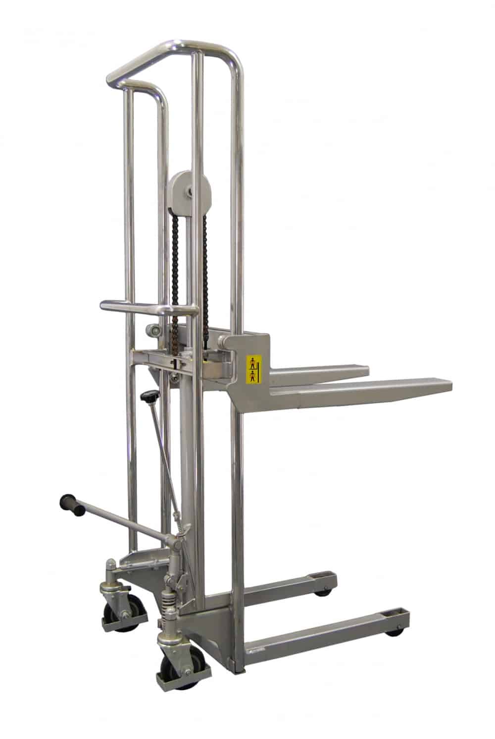 Den hydrauliske ministabler er udstyret med både faste gafler og en tabt, forkromet platform til multifunktionsbrug. Du kan håndtere halvstore paller og/eller bruge det som et mobilt løftebord. Manuel ministabler med foldbart fodpumpegreb til løft og manuel drejeknap til sænkning.