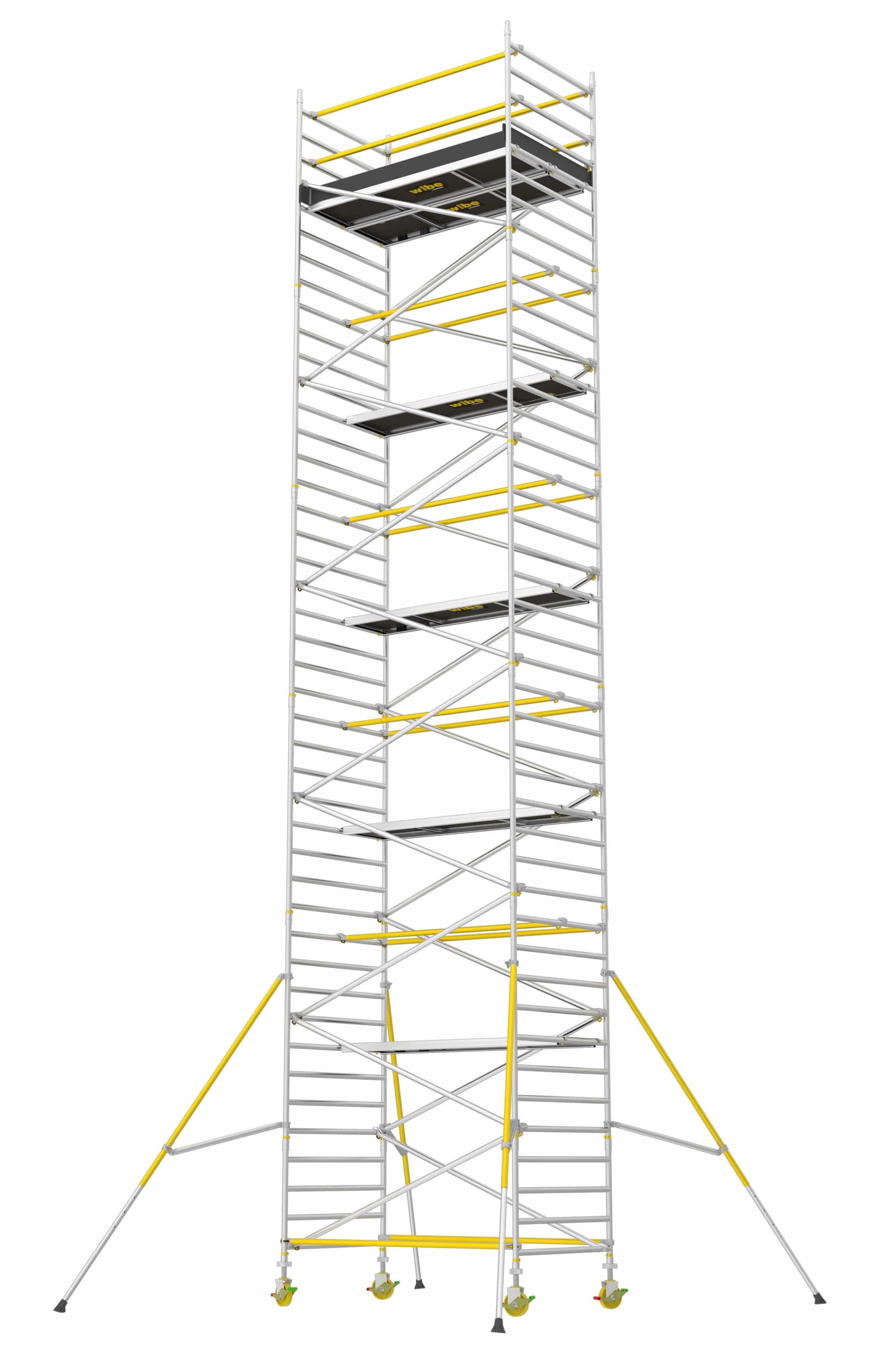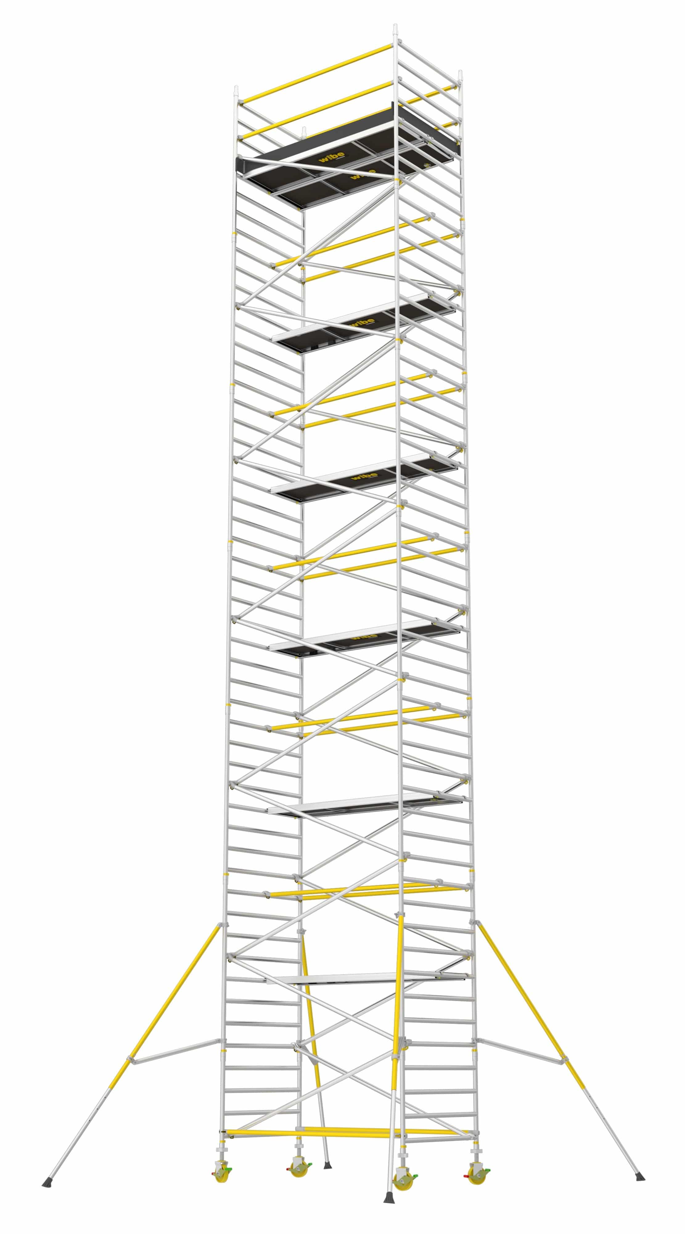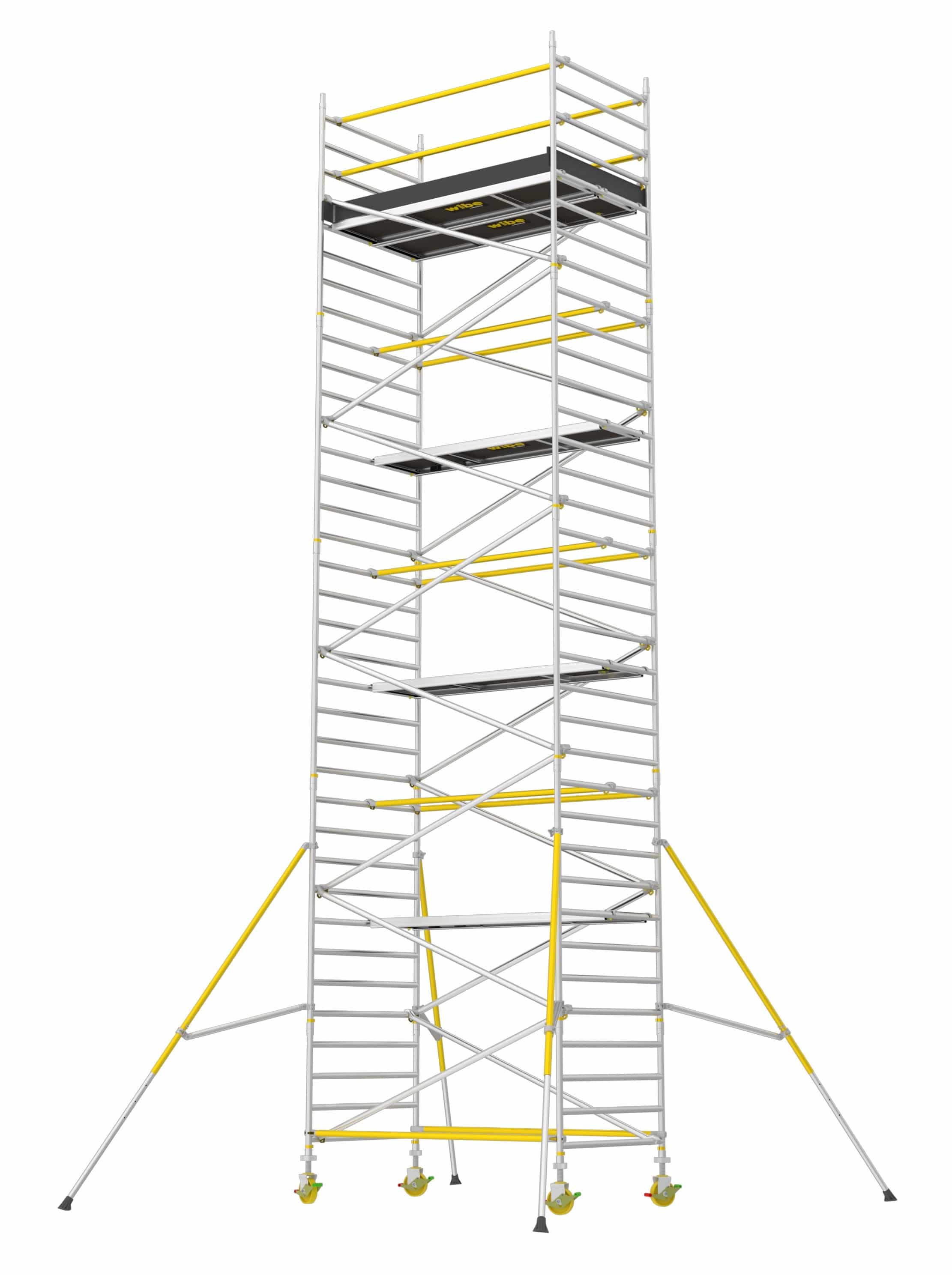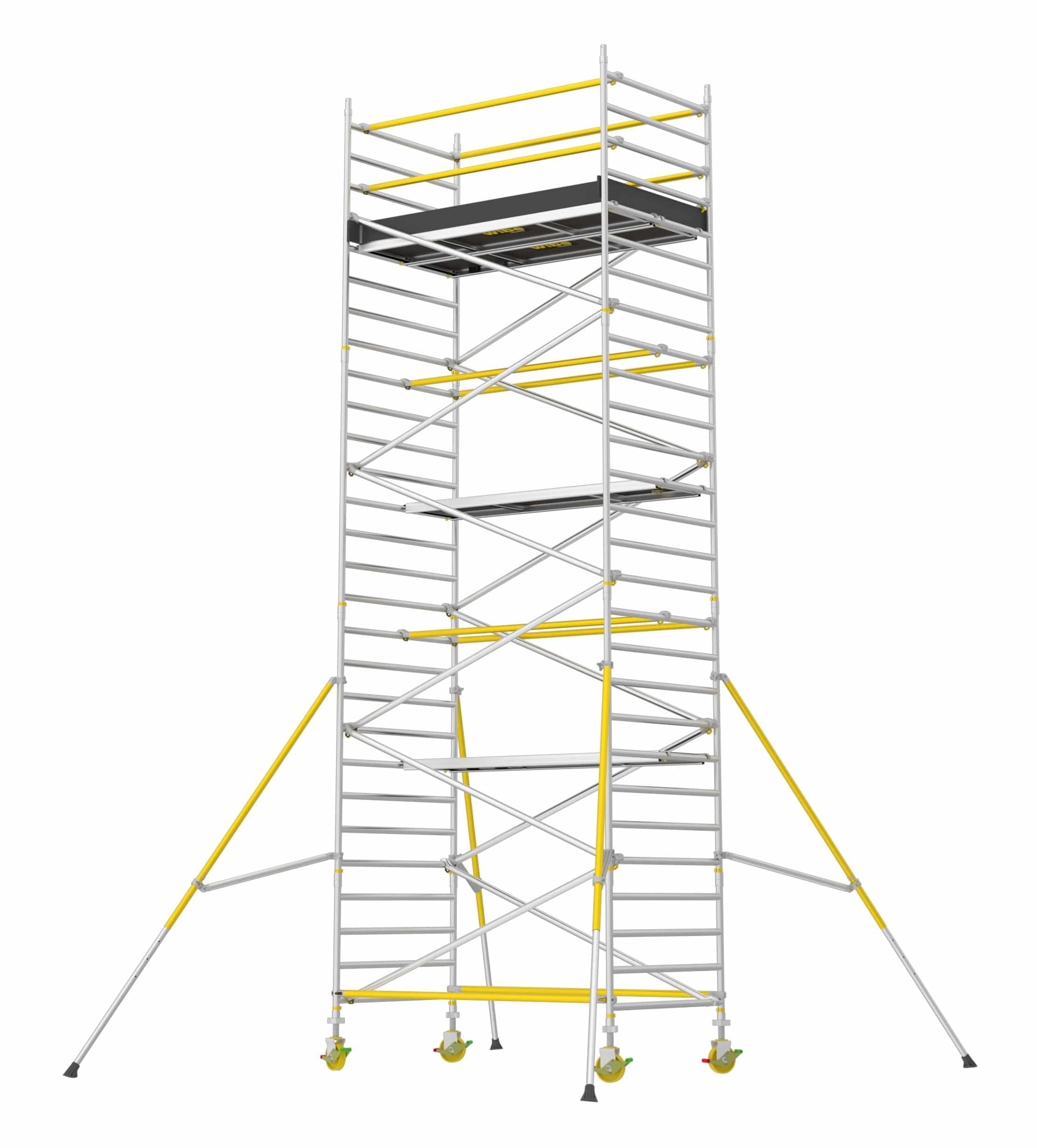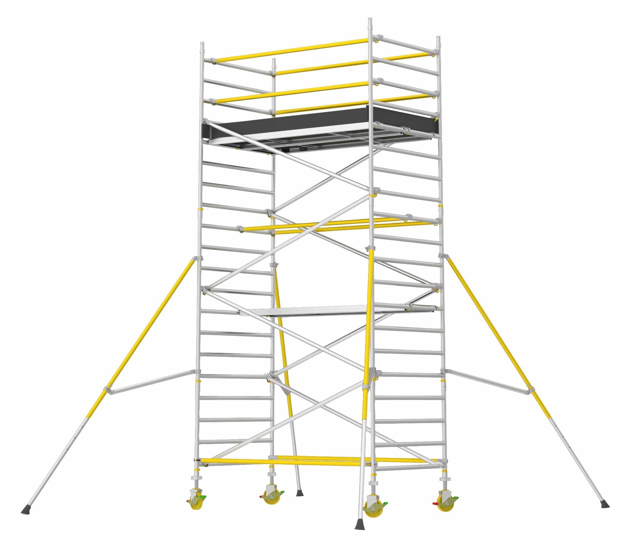 Et robust rullestillads (1,4 x 2,5 m) der er let at samle med overlappende afstivning og gennemtænkte løsninger for et mere sikkert arbejdsmiljø. Komplet med platform hveranden meter, to topplatforme, fodliste sæt, justerbare hjul (200 mm) og støtteben.