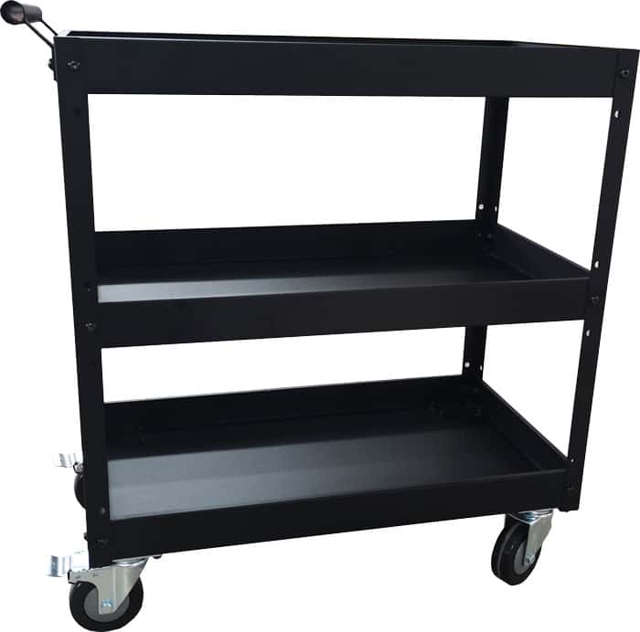 Rulleværkstedsvogn med 3 hylder 50 kg pr. hylde og 4 drejbare hju,l hvoraf de 2 hjul er med bremselås 763x389x796mm.