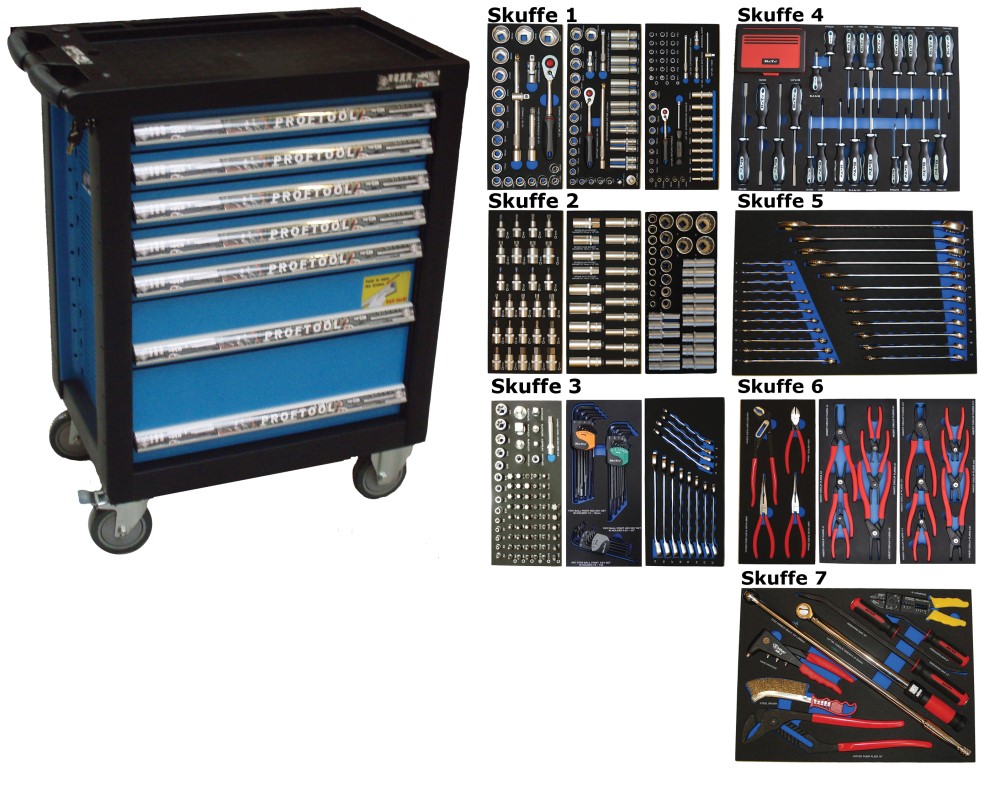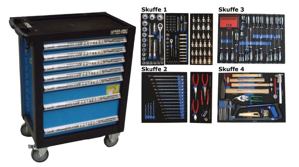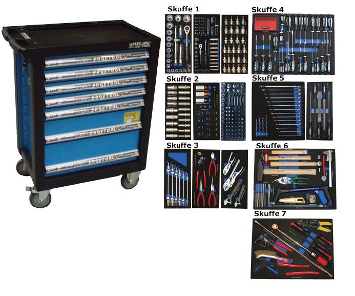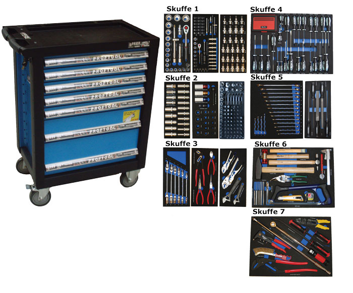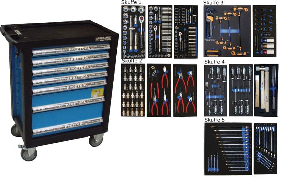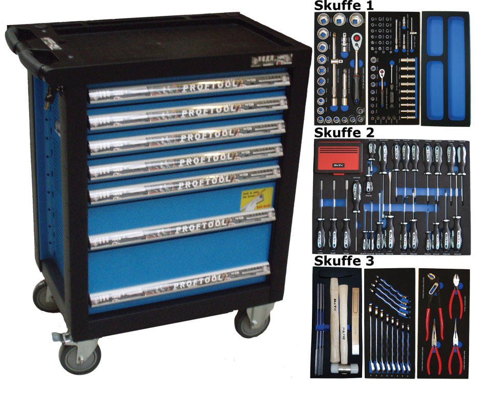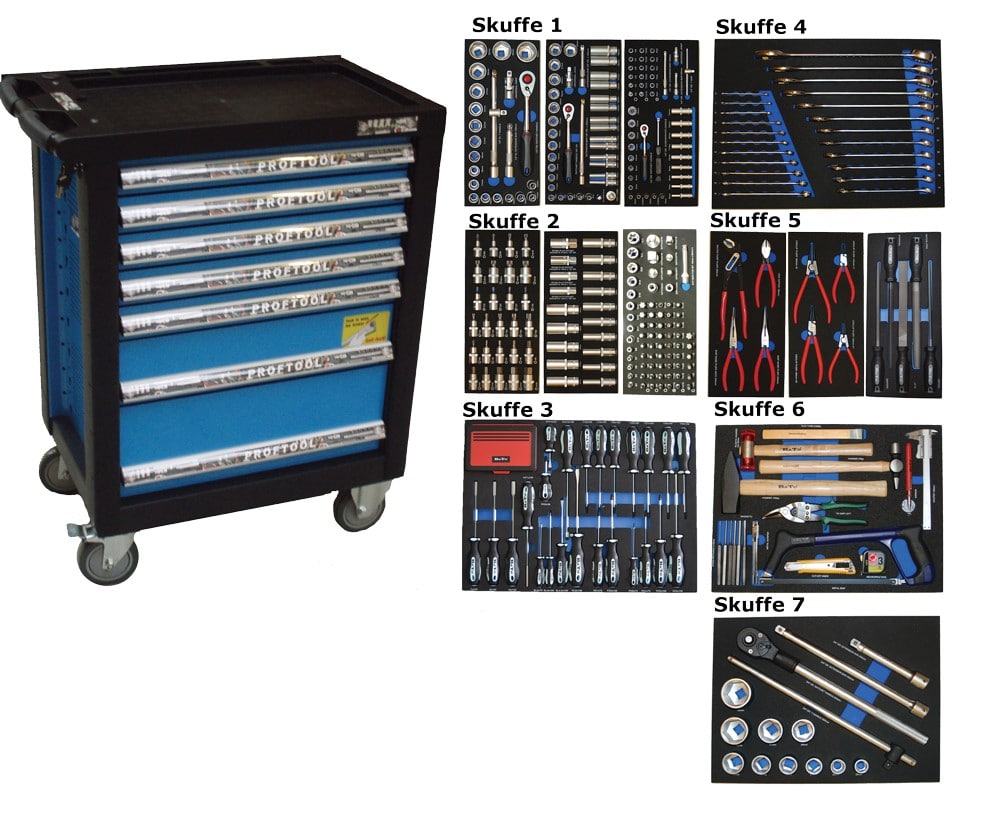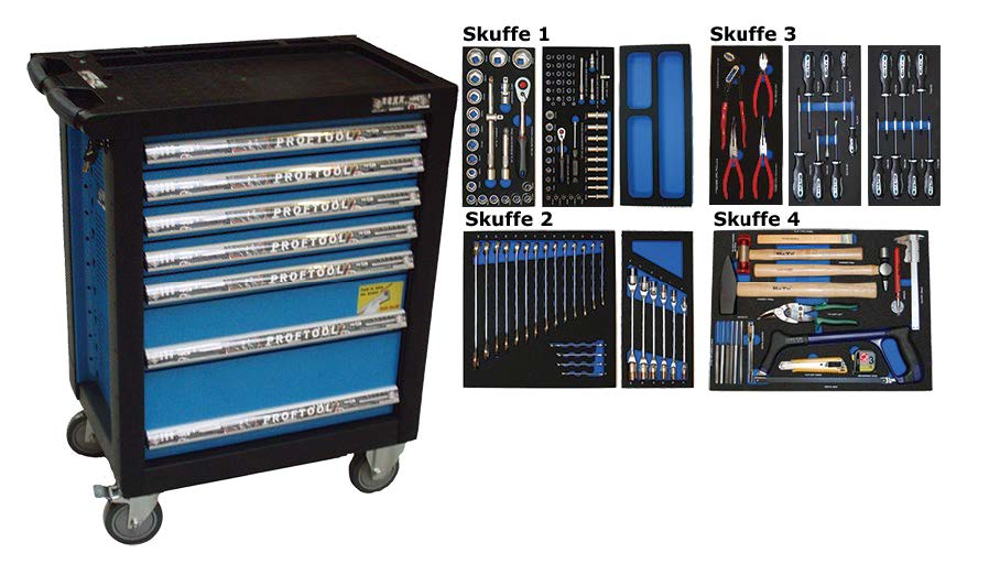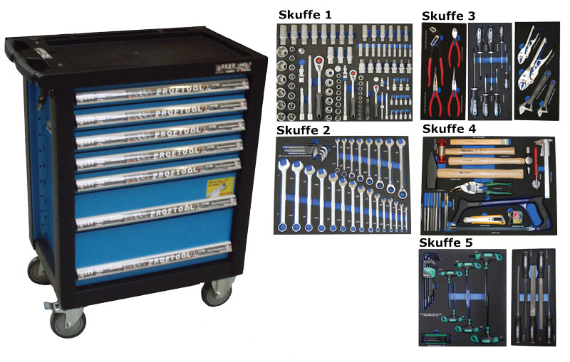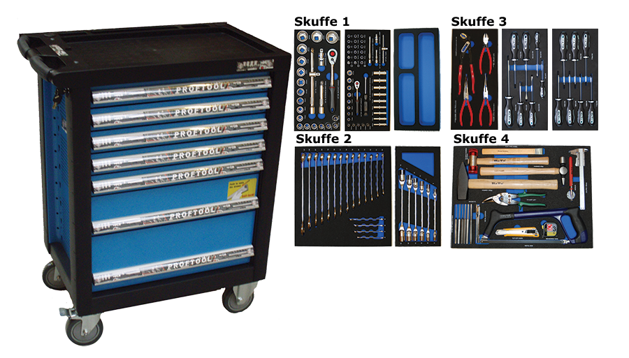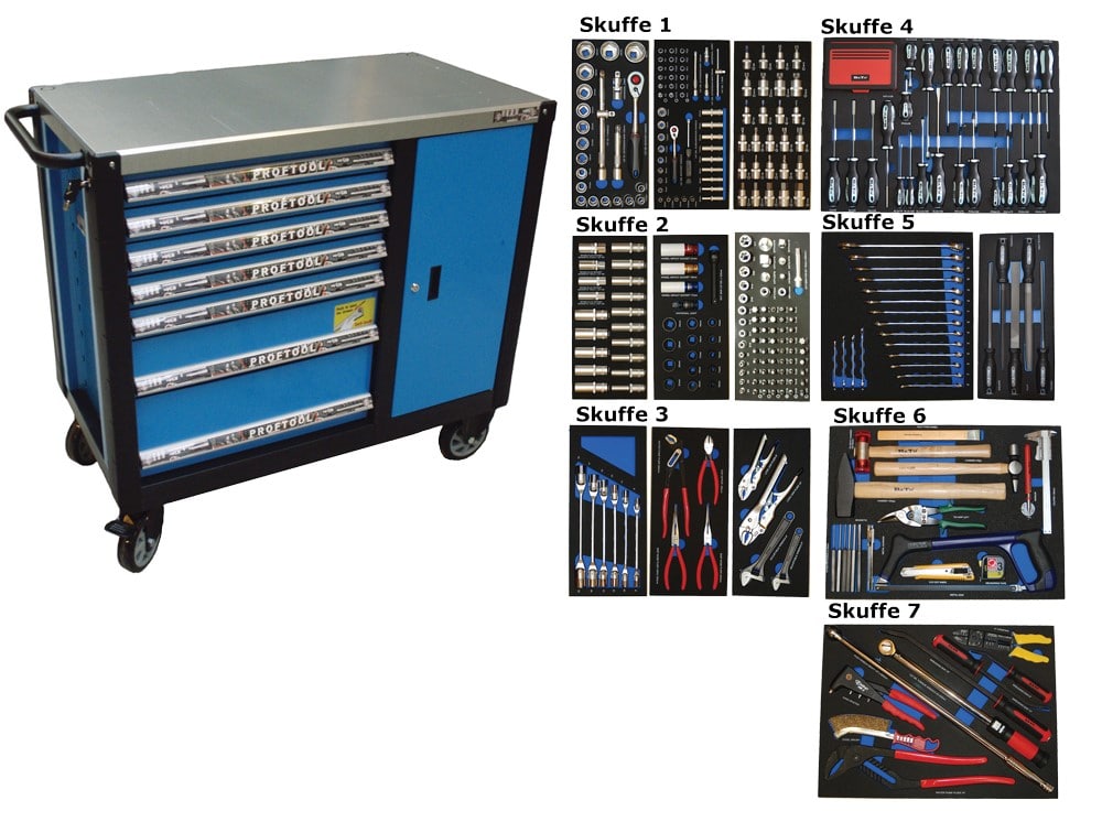 - Værktøjsvogn med 7 skuffer. 5 skuffer med værktøj 231 dele i formstøbte EVA skum.