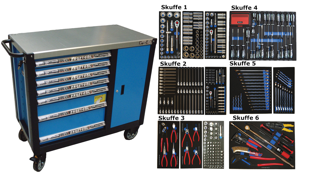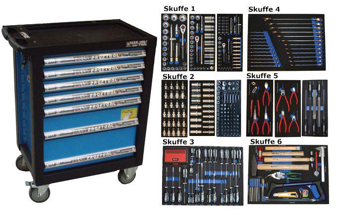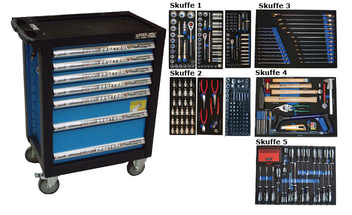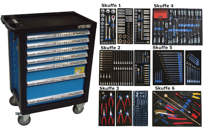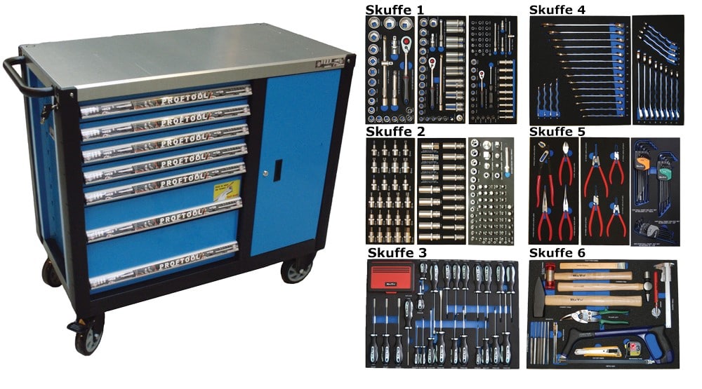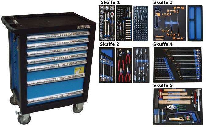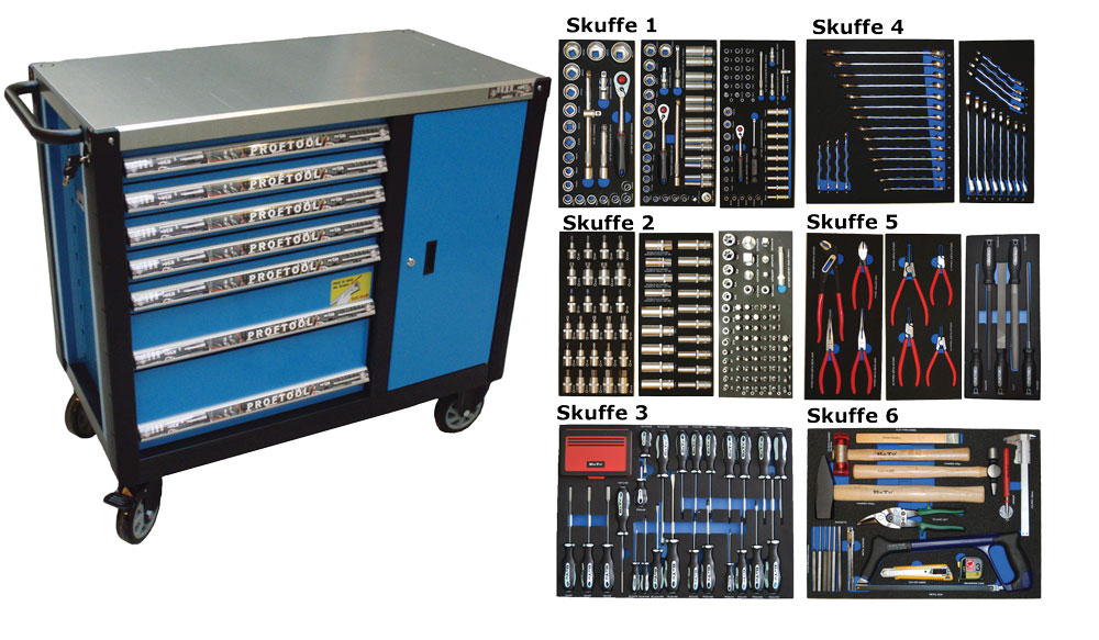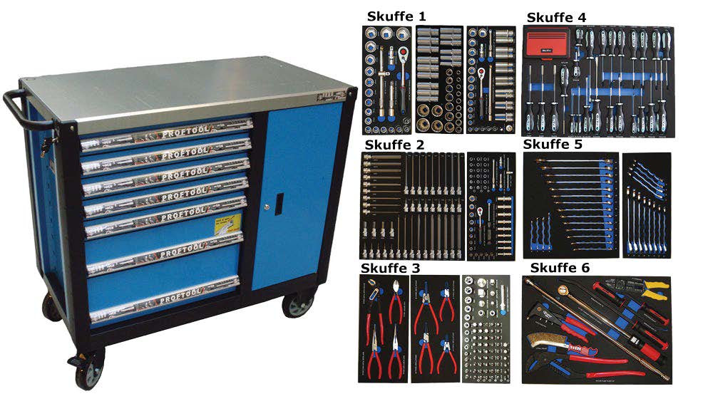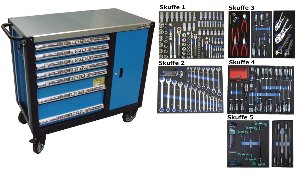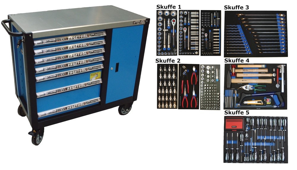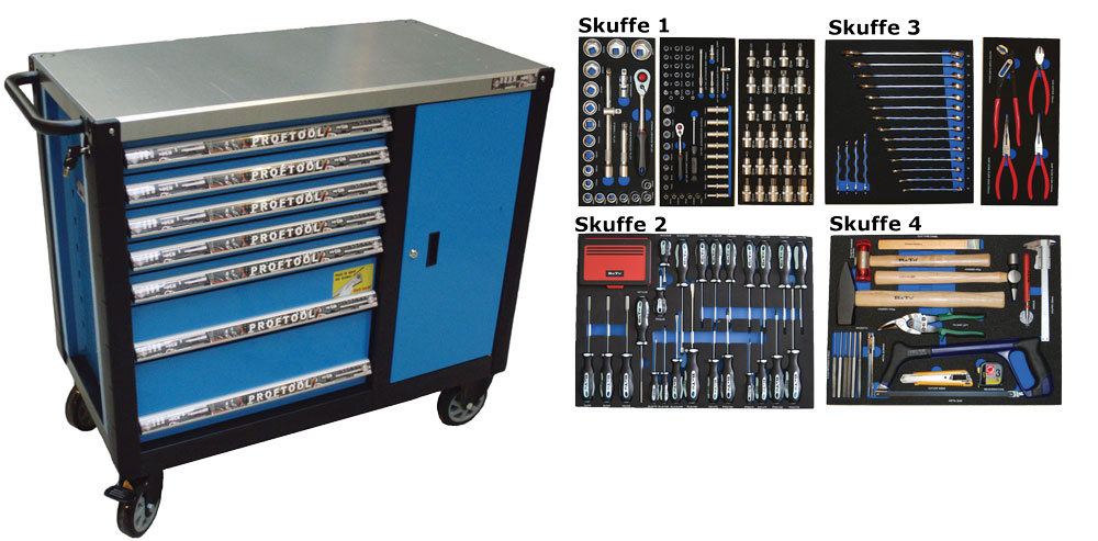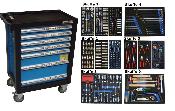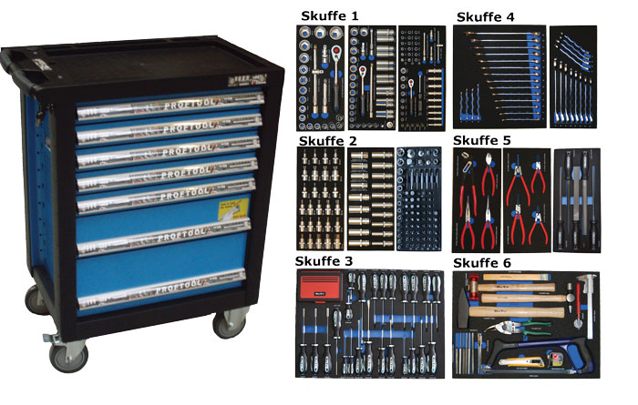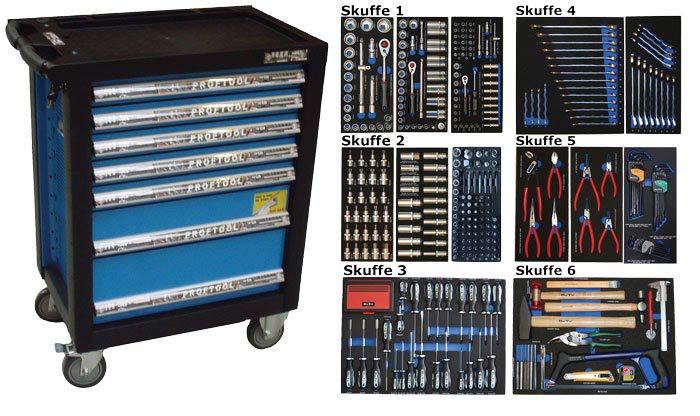 - Værktøjsvogn med 7 skuffer. 5 skuffer med værktøj 231 dele i formstøbte EVA skum.