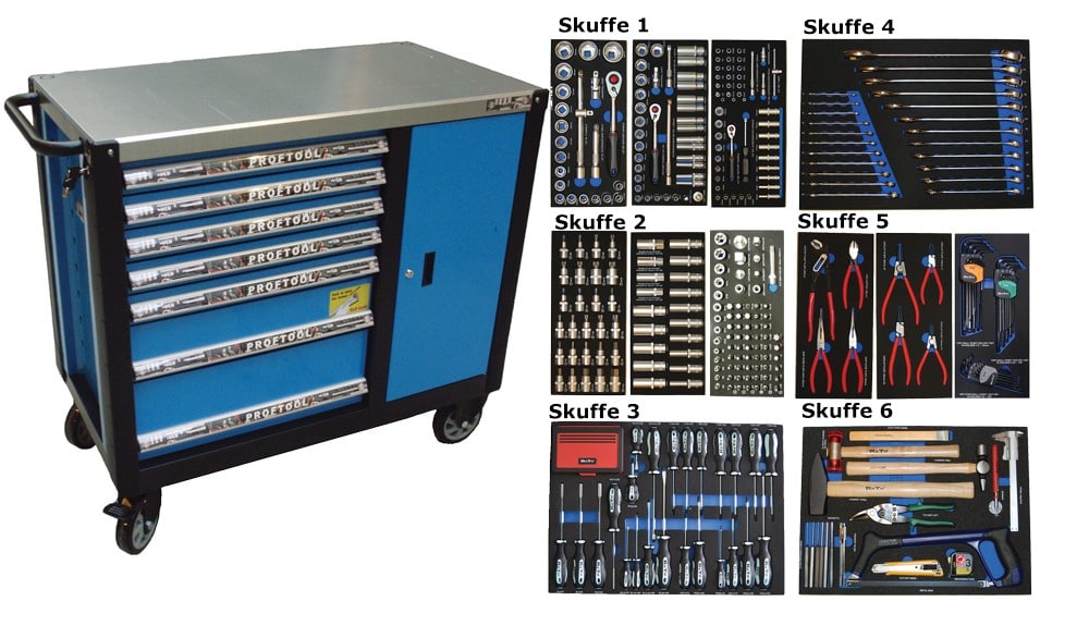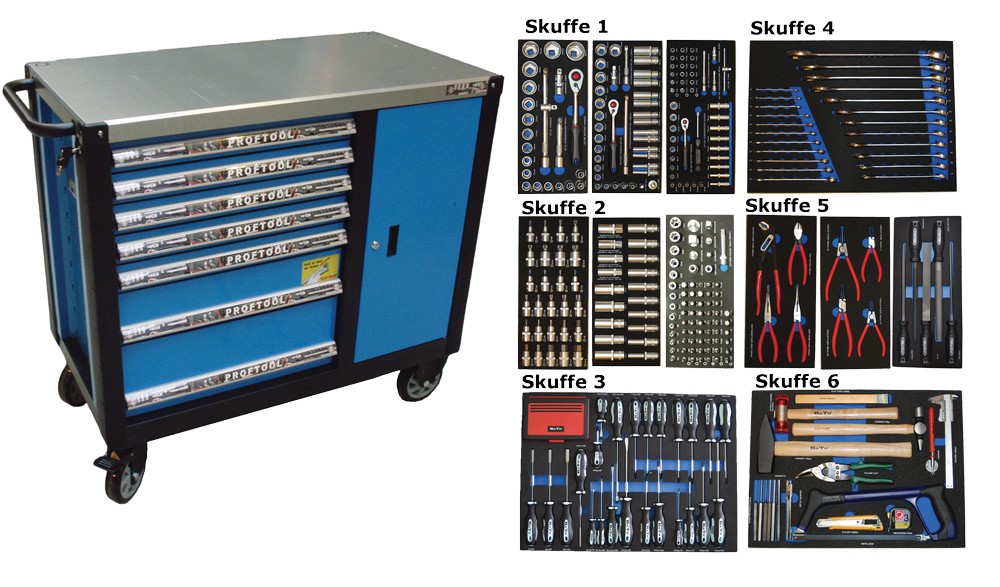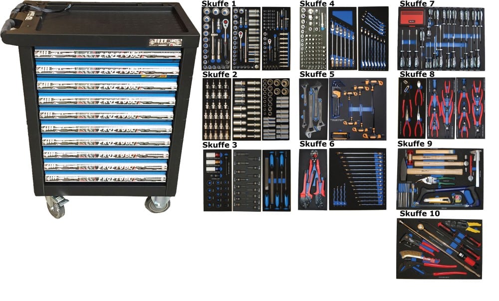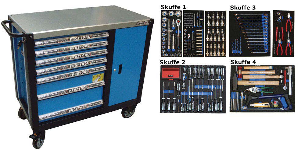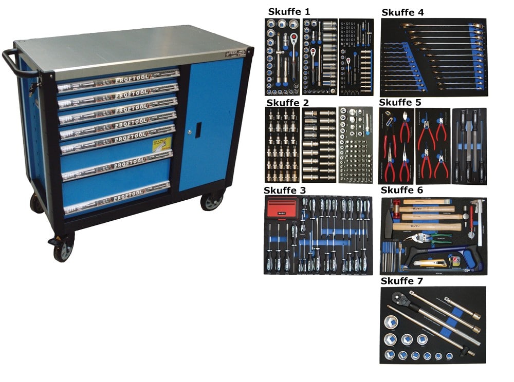- Værktøjsvogn XXL med 7 skuffer og skab. 7 skuffer med værktøj 450 dele i formstøbte EVA skum.