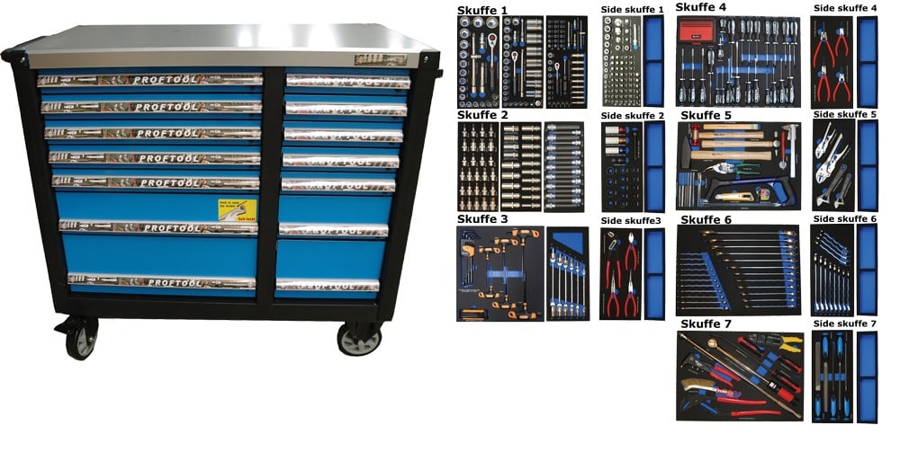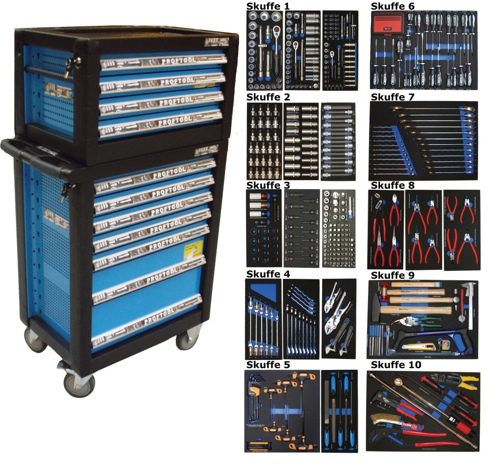 - Værktøjsvogn med 14 skuffer. 14 skuffer med værktøj 506 dele i formstøbte EVA skum.