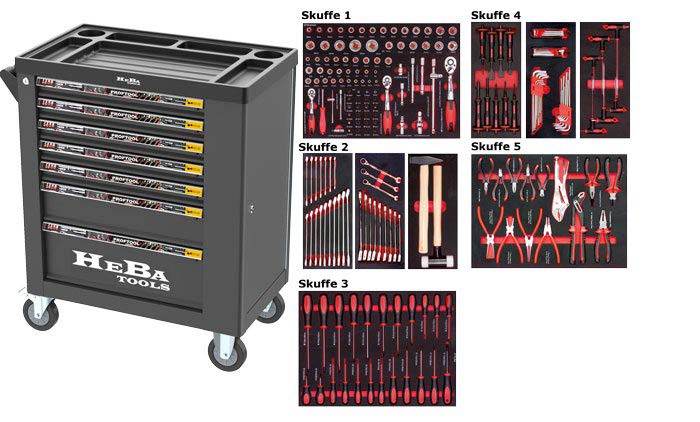HEBA Tools Værktøjsvogn med værktøj / 7 skuffer og sideskab. 5 skuffer med 206 dele.