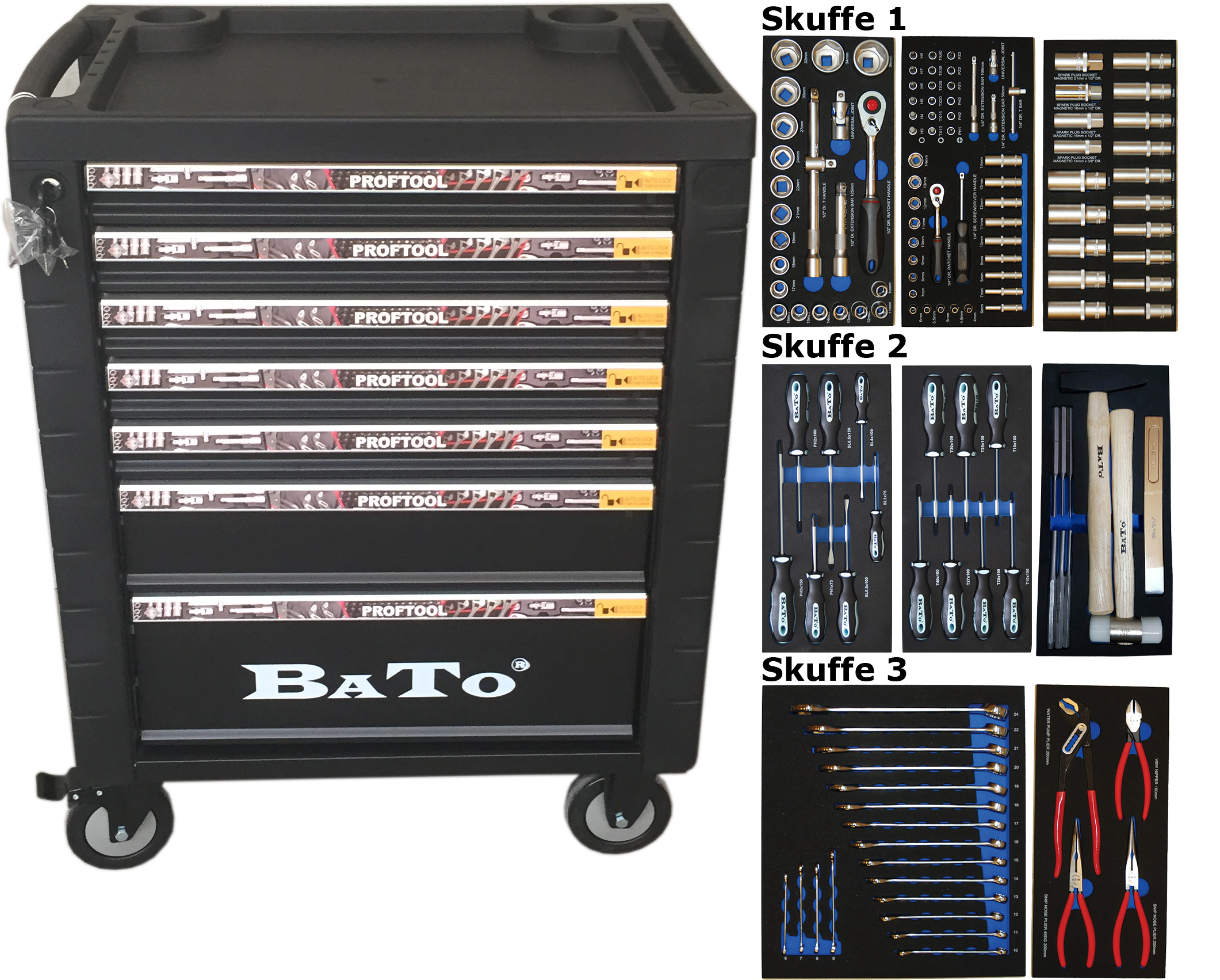 BATO Værktøjsvogn med værktøj / 7 skuffer og skab XXL TOMMER 208 dele.