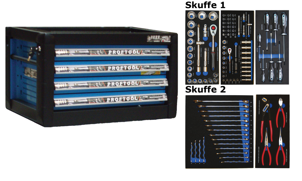 - Værktøjskabinet med 4 skuffer. 2 skuffer med værktøj 103 dele i formstøbte EVA skum.