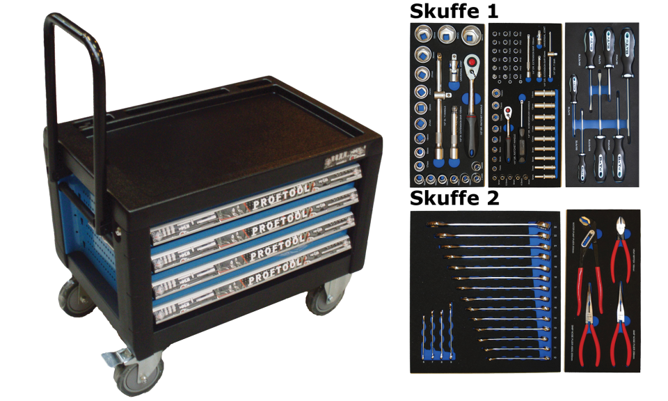 - Værktøjsvogn med 4 skuffer. 2 skuffer med værktøj 103 dele i formstøbte EVA skum.