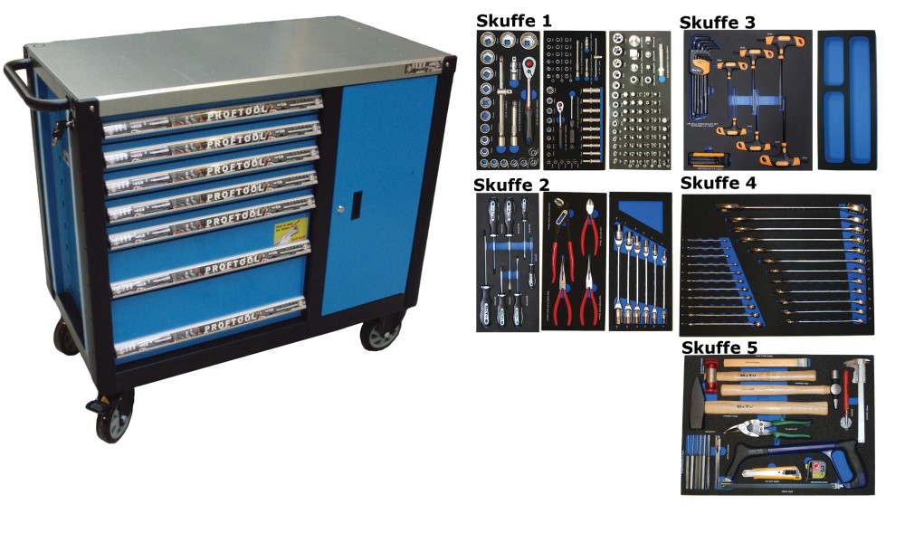 - Værktøjsvogn XXL Tommerværktøj med 7 skuffer og skab. 5 skuffer med værktøj 208 dele i formstøbte EVA skum.