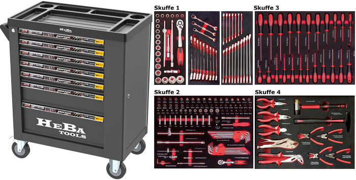 HEBA Tools Værktøjsvogn med værktøj / 7 skuffer og sideskab. 4 skuffer med 183 dele.